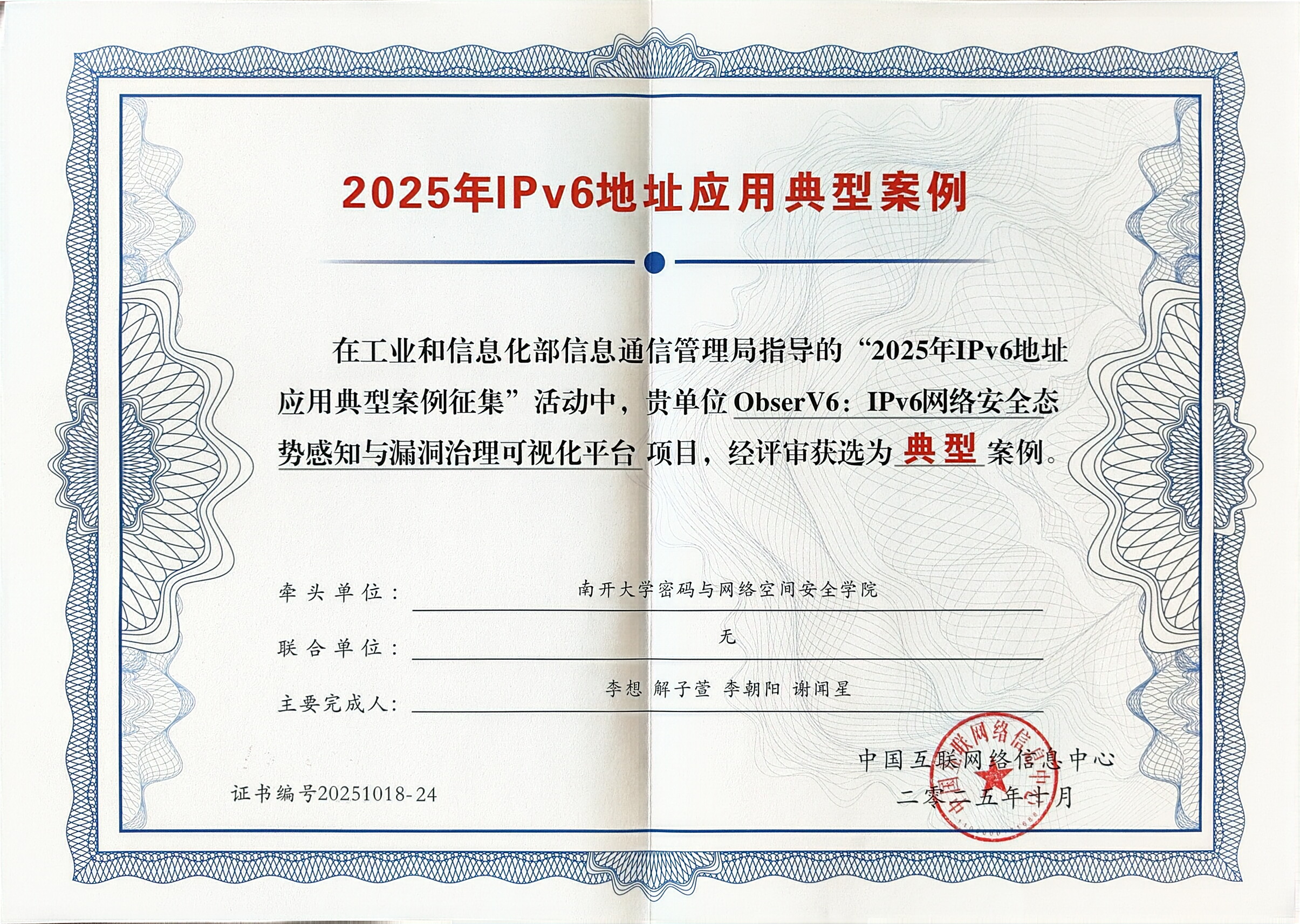 近日,由中国互联网络信息中心组织评选的2025年IPv6地址应用典型案例公布,亚色视频 报送的《ObserV6:IPv6网络安全态势感知与漏洞治理可视化平台》成功入选。